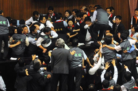 民进党确定由谢长廷出战2008挑战马英九,态势才刚确定,国民党已经摆出攻势,今天突然在各大报登出半版的广告,内容是“立法院”昨天打群架的画面,文字却特别以加粗的字体,质疑对谢长廷以暴力“治国”。