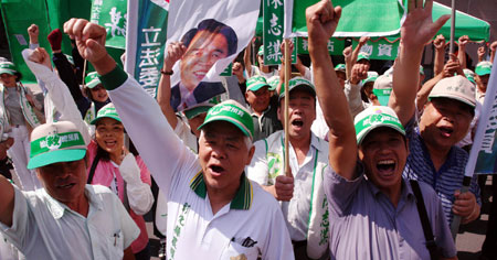 台北市济南路上的民进党支持者,大约从9时30分起才开始陆续出现,每支队伍前方必定高举“立委”为名的绿旗帜,代表该名“立委”动员而来。