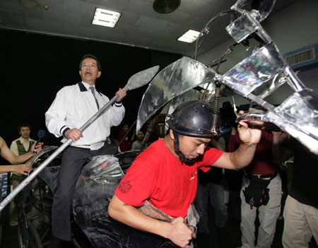 中新网5月18日电 民进党2008参选人谢长廷昨天到一剧团看排练,现场还秀演技跨上“铁马”扮起唐吉柯德。