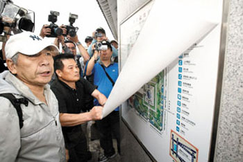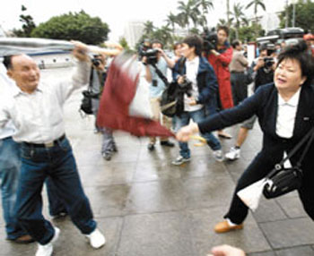 中新网5月20日电 台北“中正纪念堂”昨天举行改名揭牌仪式,频传群众滋事冲突。其中,有人拔掉新设“台湾民主纪念馆”牌子,还有人公然露下体向陈水扁呛声。
