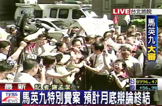 中新网7月3日电 马英九特别费案六度开庭,辩方今天(3日)传唤3名证人,都是马英九市长办公室秘书,要为特别费的申领作业程序作证,现场也聚集许多国民党的民代列队高喊加油。