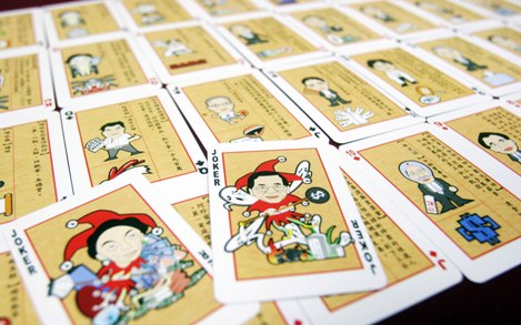在这副新出版扑克牌里,经常有争议性发言的“教育部长”杜正胜,变成了“脑残”的天线宝宝;曾向宋七力“求智慧”的谢长廷,则成了有分身的“宇宙光明体”。