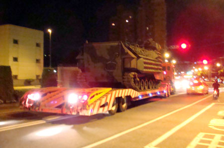 据“中央社”报道,台军地面参演部队装备包括云豹八轮甲车、复仇者弹炮合一野战防空系统、两栖突击登陆战车等均由拖车运送,尽管部队在深夜移动,仍吸引部分民众围观。台军方预计将在十月三日、六日、八日,在“总统府”前实际场地进行三次预演。