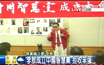 据台湾TVBS报道,“中国智慧党”成立大会,李敖说原本不打算召开,仅是为了符合“内政部”的规定照章行事,虽然成立大会会场报名成员并不多,不过李敖说,相信多年后人数将会冲高成为世界上数一数二的大党。