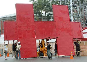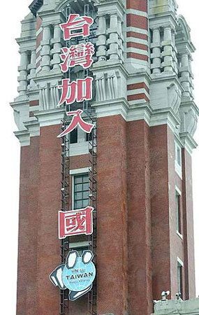 据台湾《中国时报》报道,台当局“总统府”塔楼外挂的“台湾加入联合国”大型广告,前天被吹跑“联”“合”两字,为“双十节”做准备的观礼台也被吹的七零八落。在官方赶促下,工人们只好趁着风雨渐歇加紧重新布置。