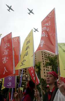 上午在“自主公民协会”成员开始集合前,曾有两名身穿红衣男子驾车出现在台北车站附近,遭警方劝离。上午八时许,则有一名身穿红衣、扎红头巾的妇人出现在景福门管制区附近,比着倒扁手势,高喊“贪腐的阿扁下台”,警方派出两名女警架离。