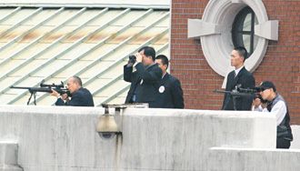 陈水扁昨天出席“双十大会”,陈水扁官邸左右两侧的楼顶,各出现配有狙击手的监控人员,每边六人,其中一人手持狙击枪,摆出预备射击姿势,半支枪身完全露在外头,肉眼就可清楚看到。射手会四处转向,做出“试瞄”动作,但并没有迹象显示他们在瞄准特定对象。