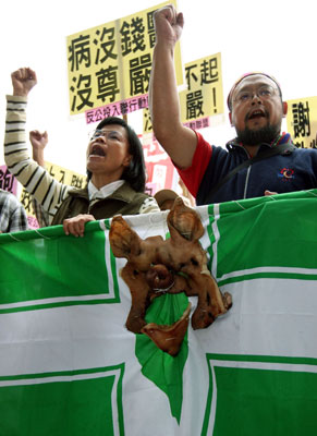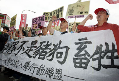 抗议者还利用猪头道具,反讽民进党参选人谢长廷日前有关“人不能只重视吃饭问题,否则就像只会吃和睡的猪狗等畜牲”的言论,质疑谢长廷,“难道不食人间烟火?”
