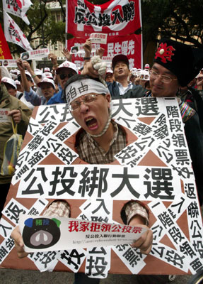 中新网10月26日电 台湾“中选会”今天下午讨论“立委”选举与“公投”领选票方式,可能须等到晚间才会有结果。反“公投入联”行动联盟上午前往抗议陈情。
