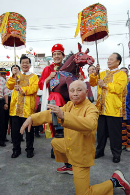 据“中央社”报道,在曾获得“薪传奖”的宜兰布马阵祖师爷林荣春带领之下,马英九穿上状元戏服,戴上红色官帽,骑着一匹道具马,有摸有样地扭了起来,令观众大饱眼福。