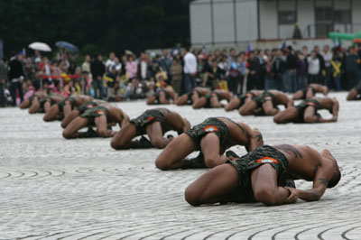 在高空跳伞表演之后,台军陆战队两栖侦搜大队赤裸上身表演蛙人操。随后“陆军步兵学校”体干班表演刺枪术,演出团体刺、冲锋对刺、刺枪击破等项目。不过,当天使用的是练习用木枪,并非配上刺刀的真枪。