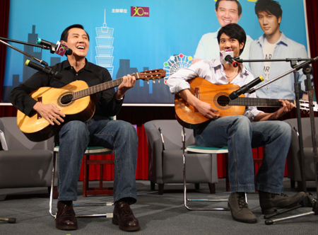 据“中央社”报道,马英九穿着牛仔裤和Polo衫和王力宏合唱英文歌曲《I Understand》。马英九说,这是他高三时花了一百七十多元买的吉他,练的第一首歌曲。王力宏则从未听过此曲,他笑着说,先前还热心找了一些“老歌”,没想到在马英九眼里全是“新歌”。