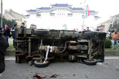 中新网12月6日电 台北中正纪念堂前发生意外。上午十一时左右,有男子驾驶货车冲撞“大中至正”门口的人群,其中一名正在采访的记者受重伤。