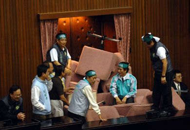 据台湾TVBS报道,“中选会组织法”今天再度开战,上次会议中绿营用大锁将王金平锁住,不让会议顺利进行,今天蓝营先一步将门把拆掉,不让事件重演,但绿营还是出招,出动“议会”里的椅子整个堵住大门,不让王金平进入会场,整个议事再度呈现停摆。
