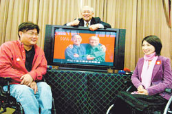 红党推出选战政党广告,由范可钦(左)主导的影片中,具绿色色彩的该党党主席陈耀昌(中)和深蓝色彩的秘书长姚立明相互搭唱。右是红党不分区“立委”排名第一的杨玉欣。来源:台湾《中国时报》
