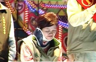被酒驾肇事追撞受伤还带着护颈的妻子坐在台上造势,直说“我们不能流泪,我们流泪要流到1月12日,我们后天晚上开票,流高兴的泪水……”