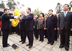 蒋经国逝世二十周年之际国民党主席吴伯雄与亲民党主席宋楚瑜联袂前往头寮谒灵。 来源:“中央社”