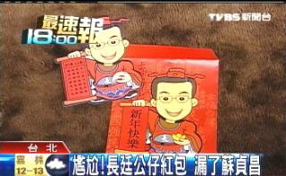 民进党的长昌配设计公仔红包,不过支持者发现红包袋上只有谢长廷公仔,漏了苏贞昌。 TVBS图
