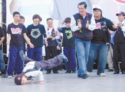 马萧台南县竞选总部成立大会,马英九(右3)与年轻人大跳街舞,争取年轻族群支持。(图:台湾《中国时报》)