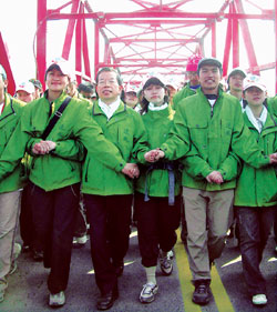 谢长廷(左2)17日与绿营青年军手携手跨越西螺大桥,走过浊水溪。(图:台湾《中国时报》)