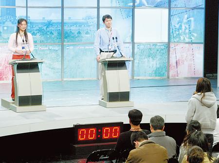 马英九与谢长廷首场电视辩论会将于今天登场,主办单位昨天排练民众提问时,特地在左边位置准备小木板给谢长廷,让其与马英九高度相当。(图:台湾《中国时报》)