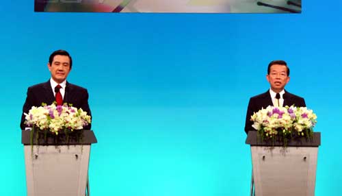 马英九与谢长廷出席电视政见发表会。(“中央社”图)
