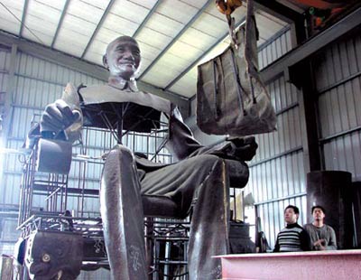 中新网3月4日电 号称全台最大的原在高雄的蒋介石铜像拆卸后送大溪镇公所,经过桃园县等单位协调,预计本周运往大溪慈湖两蒋文化园区焊接、补强、组合。据悉,新的铜像将“虚位”在民众面前,不过这种后现代解构主义的创造听在原创者林木川的耳朵里,直说“简直不伦不类”,感觉似乎被五马分尸。