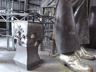策展人桃县公共艺术审议委员、也是台湾雕塑学会常务监事的郭少宗解释,保留原件的头、胸、右手臂、左手臂及两只鞋子,仅局部磨光修饰,撑立于架空的座椅与重组的躯体上,是记录历史原貌的重要点。