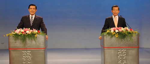 中新网3月8日电 台湾地区领导人选举第二场候选人电视政见发表会七日晚登场,国民党候选人马英九与民进党候选人谢长廷再度自制政见广告牌,透过两轮交叉政见发表方式,就妇女政策、承认大陆学历、开放陆资投资住宅、攻击家人负面文宣、北高(台北、高雄)市长政绩等议题攻防。