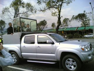 据台湾“中广新闻网”报道,由马英九阵营自行订制的“防弹扫街车”,四千八百毫升的排量,配备加厚钢板、防弹玻璃,造价至少二百万元新台币;车身经过改装,方便马萧二人站立车上时,也能沿街和选民挥手致意、甚至弯腰和选民握手,进行近距离接触。