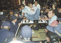 激动的绿营支持者甚至爬上车顶阻挡警车。