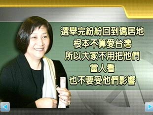 中新网3月19日电 据台湾媒体报道,挺绿的艺人江霞在18日晚间苗栗县一场长昌造势会上,抨击从海外回台支持马萧的艺人,赶在选举前回来投票,选后就回侨居地,这种人根本不爱台湾,并语出惊人地说也不用把他们当人看。