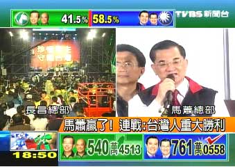 中新网3月22日电 据台湾TVBS报道,2008年的台湾地区领导人选举结果出炉,马英九、萧万长确定以得票超过7百万张,超过58%的得票率当选。国民党荣誉主席连战在马萧总部发表谈话时说,“选举的结果,真正的给我们带来了一个不一样的明天,一个和谐融洽的社会,大家都是一家人,不再有任何的对立、仇恨。”