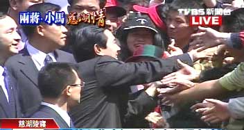 报道说,在民众热烈的欢呼声中,马英九、萧万长抵达蒋介石慈湖陵寝。马英九以微笑回应民众,并与民众握手、打招呼。