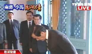马英九在蒋介石灵前行三鞠躬礼。(台湾TVBS图)