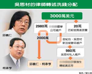 律师表示,邱义仁和金纪玖两人事先答应吴思材,如果和当事国“建交”成功会给他两百五十万美元酬劳,但事后他没拿到一毛钱;黄志芳又对吴思材说会给他一百万美元补偿,还是没有兑现。