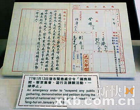 台“总统府”9日上午开放民众参观,展览室内展出历任“总统”文物及公文稿,据台湾媒体9日报道,其中包括1988年蒋经国逝世时,马英九受命用毛笔撰写的紧急处分令真迹,规范在“国丧”期间,全台禁止聚众集会、游行、请愿等活动,当时马英九是“总统府”第一局副局长,签出来的文稿还要层层上报,由长官批示,最后由继任“总统”的李登辉批定。