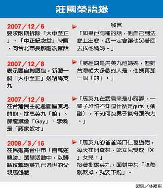 庄国荣从去年拆除“中正纪念堂”牌匾争议,到今年“大选”期间,一连串的言行,均引起社会震撼。尤其今年3月16日参加民进党造势活动,以粗话批评马英九的父亲,舆论哗然。