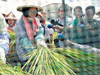民进党主席蔡英文今天在嘉义下田割稻,并在传统打谷机上打谷,架势十足。 台湾《联合晚报》图