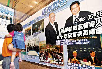 国民党中央一楼大厅即日起展出胡连会、胡吴会等会谈照片,这也是胡锦涛照片第一次出现在国民党中央并公开展出。 台湾《联合晚报》图