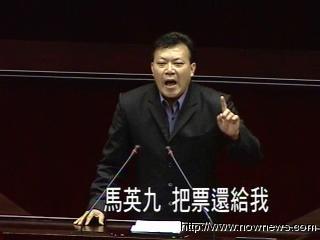 民进党“立委”苏震清呛声说,“马英九把票还给我!”不过国民党“立委”徐少萍马上反击:“我不知道苏委员你是不是把票投给马英九,不然你不能代表所有的台湾同胞。”