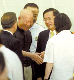 民进党全代会开幕式结束后,前党主席许信良(左二)趋前向陈水扁(右二)、谢长廷(左一)及党主席蔡英文(右一)致意。(刘宗龙摄)