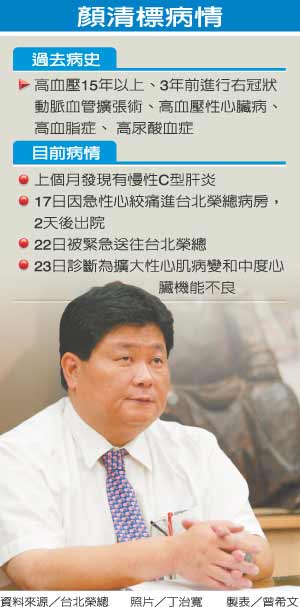据台湾《联合报》报道,外界质疑颜清标装病逃避入监,其主治医师周嘉裕表示,颜清标的心脏明显扩大,有严重肺积水等病症。他反问:“像肺水肿这种,怎么假装?”