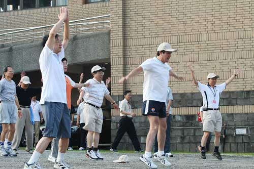 马英九(前右二)七月二十五日在阳明山上,与台行政当局高官们一起做早操。(“中央社”图)
