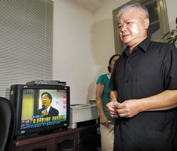 特侦组发言人陈云南3日傍晚对外说明约谈陈水扁的相关案情,恰巧陈水扁同时间在办公室召开记者会为自己辩护。透过电视转播,两人彷佛隔空交战。(图:台湾《中国时报》)