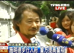 中新网9月9日电 前民进党主席施明德9日计划与马英九会面谈反贪腐议题,在未获回应后,与倒扁总部骨干范可钦等人步行前往并进入了马英九办公室;马英九办公室由秘书长詹春柏出面接待。
