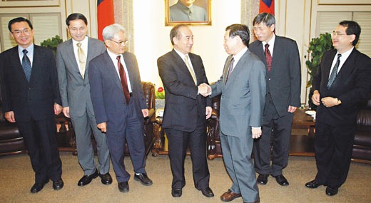 台湾“司法院”新任“大法官”(左起)叶百修、陈春生、黄茂荣,陈新民(右一)、陈敏(右二),3日由“司法院秘书长”谢文定(右三)带队拜会台“立法院长”王金平(右四)。(图:台湾《联合报》)