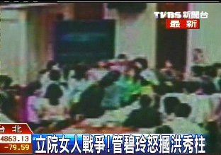 但国民党“立委”洪秀柱上前制止时,将绿营女“立委”手中的广告牌拨向一旁管碧玲的助理,造成助理眼睛受伤,管碧玲不满上前理论,情急下居然打了洪秀柱一巴掌,让洪秀柱火冒三丈爆发拉扯。