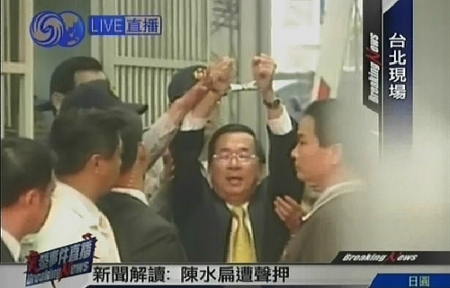 台湾“今日新闻”报道说,陈水扁下午4时30分许步出特侦组准备上车时,面对媒体高举铐着手铐的双手,喊完口号才上车,一副从容就义的模样,显然有备而来。