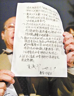 律师李胜雄走出宝徕代吴淑珍发表三点声明的亲笔签名。(姚志平摄)